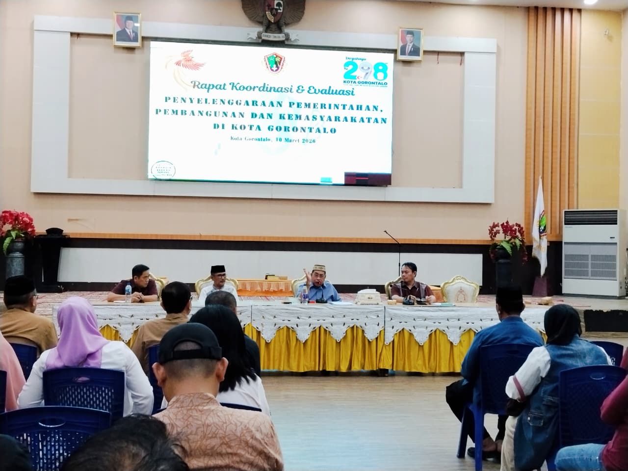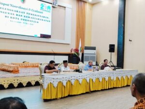 GORONTALO – Pemerintah Kota Gorontalo menggelar Rapat Koordinasi dan Evaluasi (Rakorev) Penyelenggaraan Pemerintahan, Pembangunan, dan Kemasyarakatan yang dibuka secara resmi pada Selasa (10/3/2026) pukul 22.00 WITA di Aula Rumah Dinas Wali Kota Gorontalo.